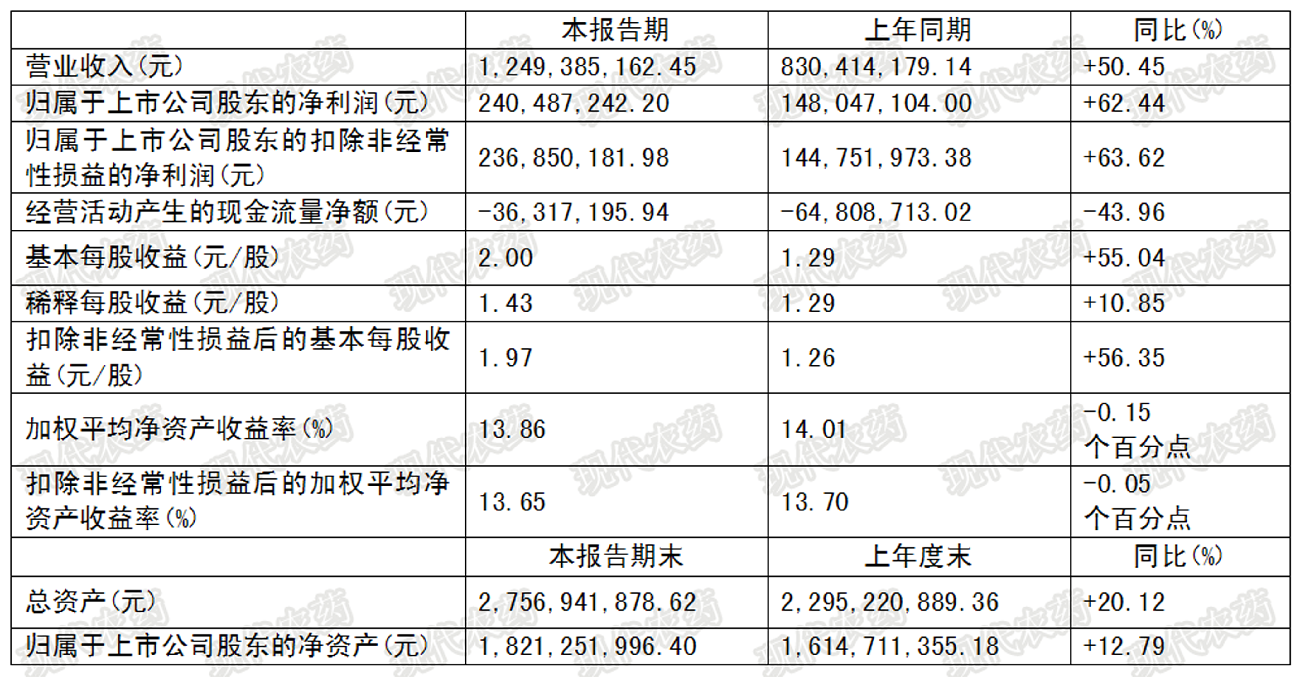 报告期内,公司实现合并营业收入124,938.51万元,同比增长50.45%;实现归属于上市公司股东的净利润24,048.72万元,同比增长62.44%。在此期间,公司取得高新技术企业证书;同时,公司自筹资金新建烟碱类杀虫剂项目开工建设。