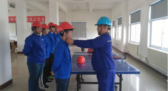 厂级培训结束后,18名学生分配到车间。一车间主任王玉雷、二车间主任刘春辉与学生见面,两位主任为18名大学生佩戴安全帽,整理工作服,检查员工“标配”装备。期望新员工的加入,为海利尔的明天注入新鲜活力。
