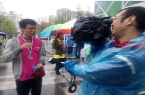 第一个跑到终点的海利尔伙伴接收青岛电视台记者的采访: