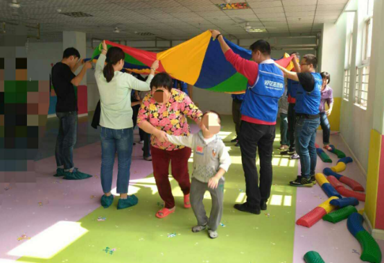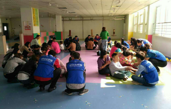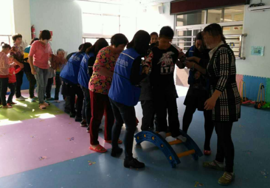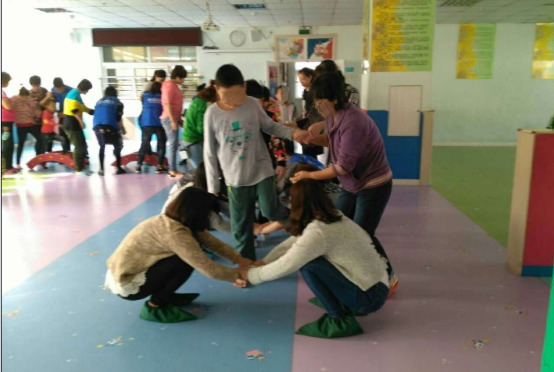 而后,在老师的指导下,志愿者们陆续开始和孩子们互动起来,协助家长一起做康复训练。到了孩子们的上课时间,志愿者们便一起做起了互动游戏。尽自己的最大努力去跟孩子们沟通、互动,别无他求,只愿他们开心、快乐!